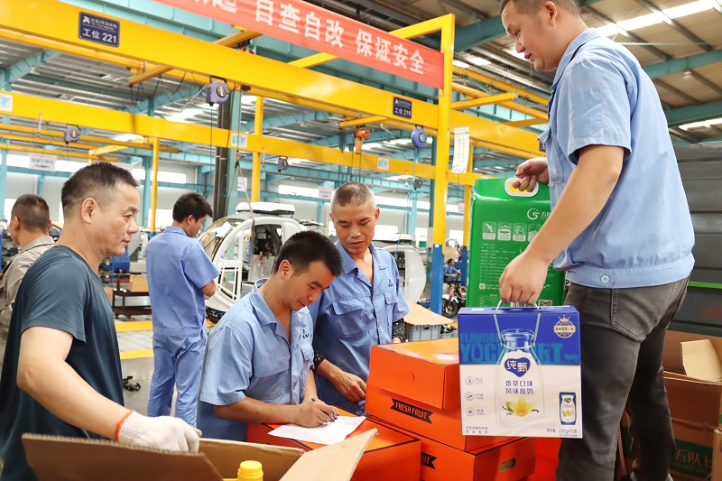 員工們分時段、分批次有序地進行領取。分發過程中,工作人員有對名單的、有派發的,還有收拾包裝盒的,忙忙碌碌的身影在人群中來來回回穿梭,溫暖而有愛。